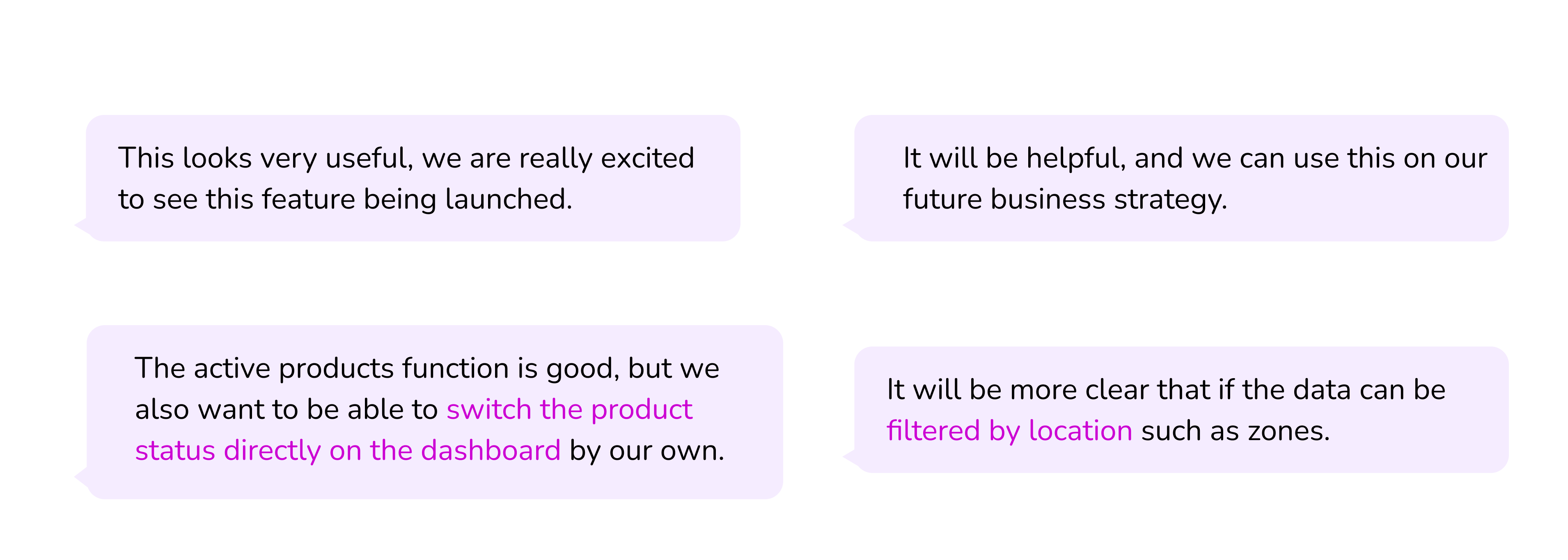We interviewed 7 merchants who were the key users of the merchant portal and showcased the prototype of the dashboard feature, overall they are quite satisfied with this new feature.